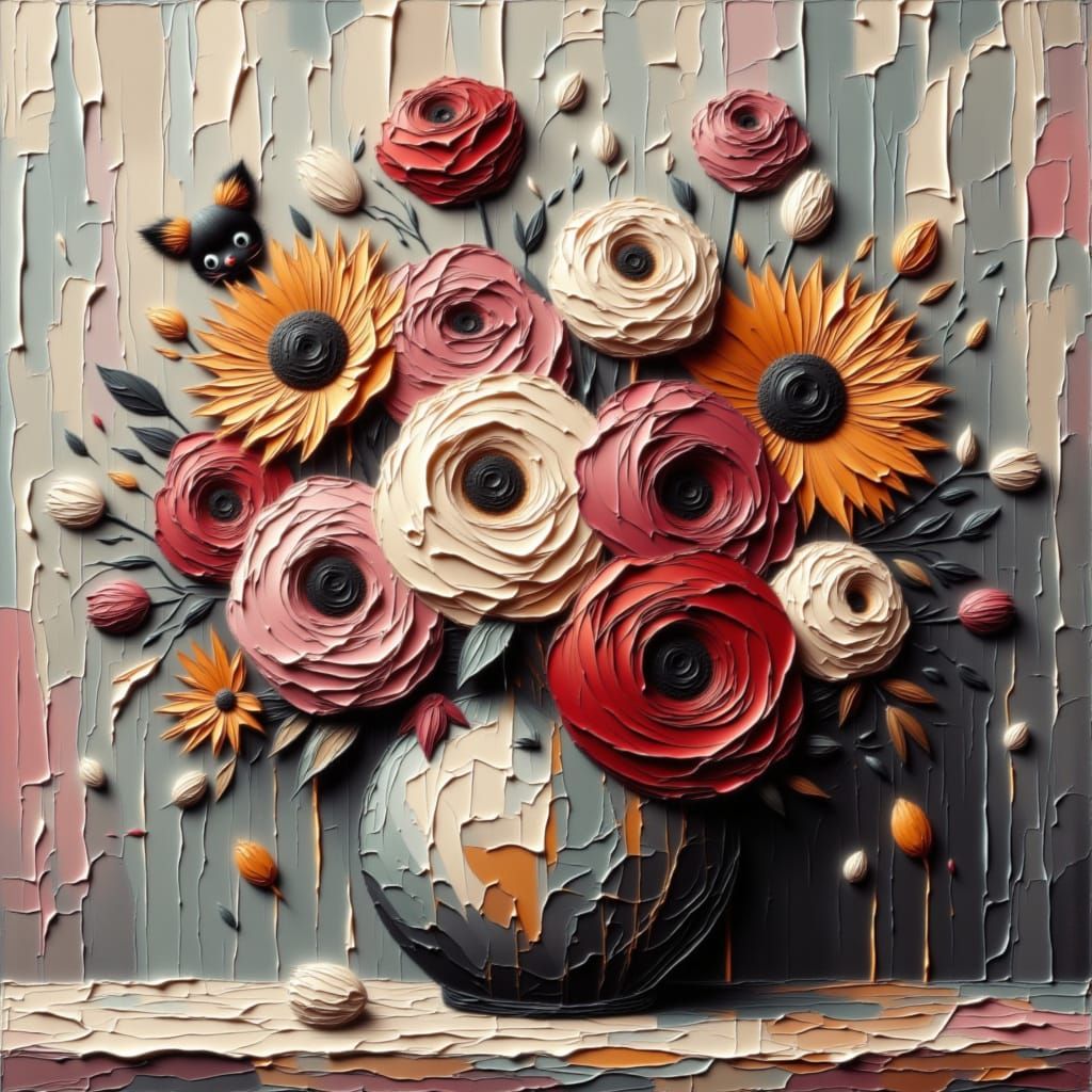 This image showcases a realistic oil painting of a diverse, colorful flower bouquet. Soft studio light accentuates rich textures and vivid petals, reminiscent of romantic impressionist floral art.