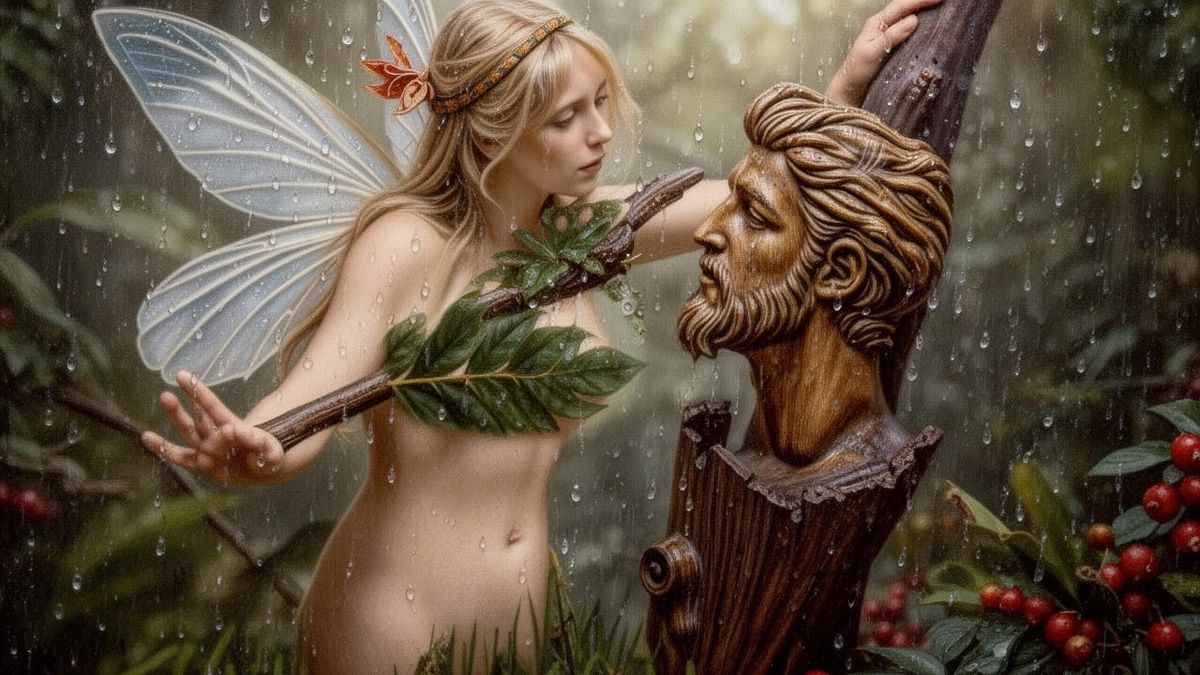 This image shows a graceful blond fairy in a misty forest, partially hidden by a wooden statue. Dewdrops and muted tones create a magical, melancholic atmosphere in a Pre-Raphaelite painting style.