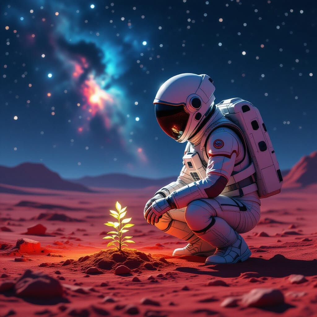 This image shows a lone astronaut in a detailed suit caring for a bioluminescent plant on a barren, red alien planet. Starry space and nebulae create dramatic lighting in this hyperrealistic concept art.