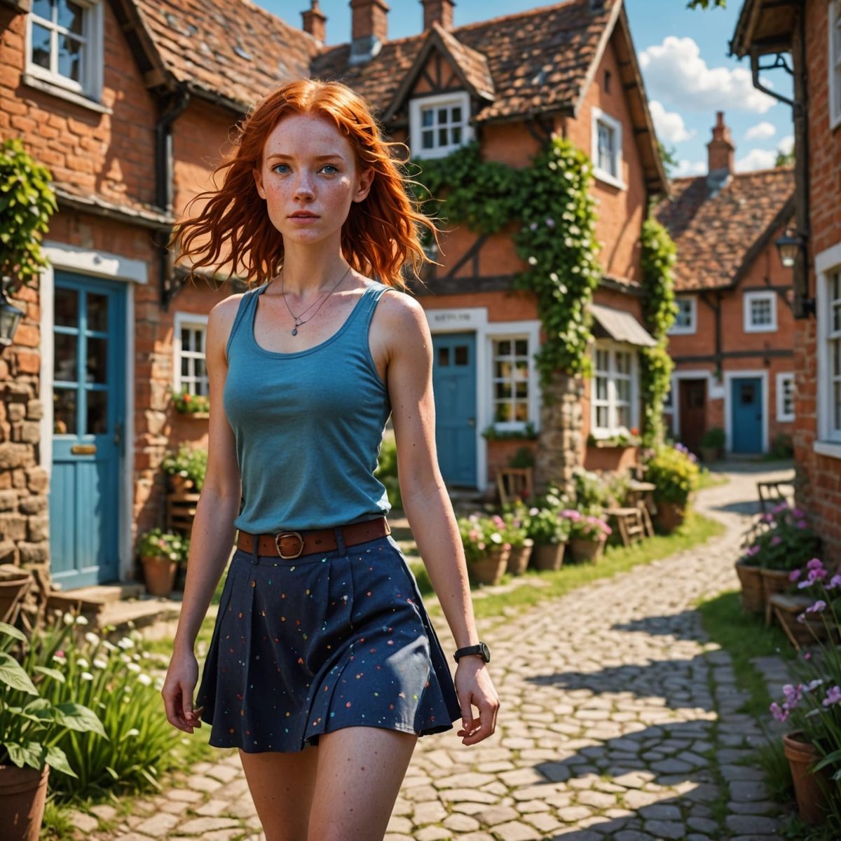 A young woman with red hair, pigtails, blue eyes, and freckles walks through a quaint English village. Captured in sharp focus with bokeh and natural lighting, evoking professional DSLR photography.