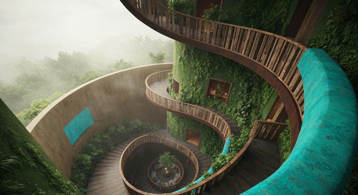 A bird's eye view of an endless, twisting spiral tower featuring organic curves, earthy tones, and reclaimed wood. Lush vegetation and misty atmosphere create dramatic shadows and panoramic views.