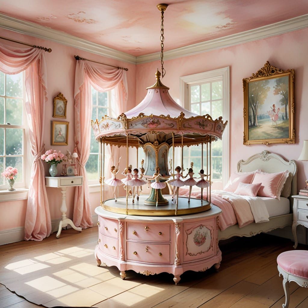 A soft watercolor painting of an open music box on an old table, featuring ballet dancers on a carousel in a sunlit, classic girls' bedroom. The charming scene evokes a sense of gentle nostalgia and whimsy.