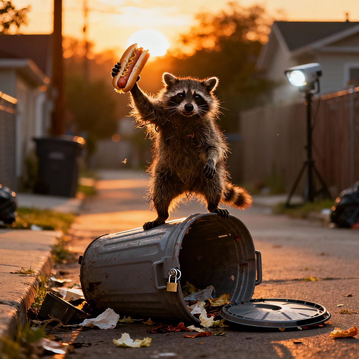 A scruffy raccoon stands proudly on an overturned trash can, clutching a hot dog. The sunset highlights the scene of his determined struggle in a suburban alleyway.