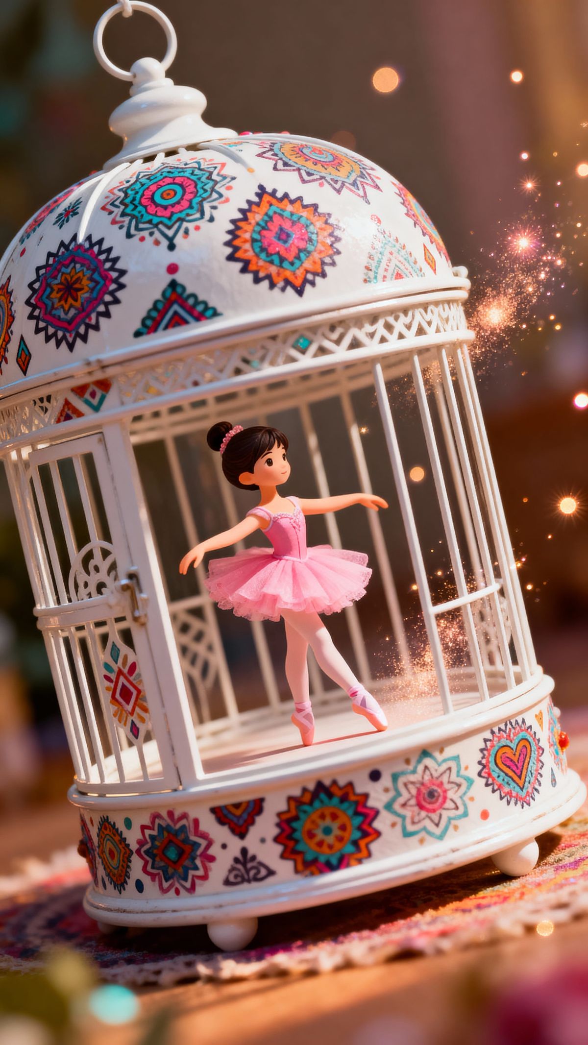 This hyperrealistic image captures a detailed white hippy birdcage holding a tiny ballerina in a pink tutu. Rendered with vibrant colors and glowing dust, it evokes concept art and pop art digital illustrations.