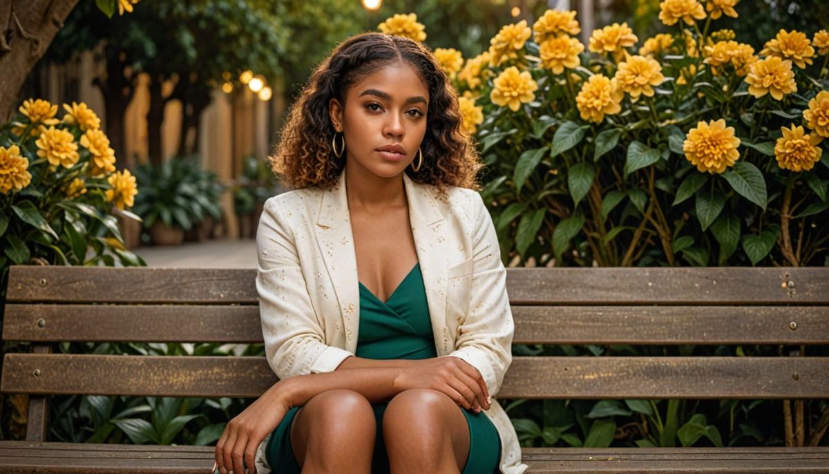 This image is a stunning close-up portrait of a young Dominican woman, captured in vibrant digital art with striking green eyes and golden flowers adorning her shoes, set against a warm and golden glow.