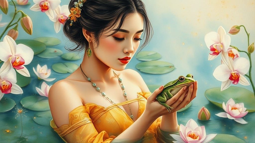 This image shows a beautiful young woman bathing in a pond surrounded by water lilies and orchids. The picture is a dreamy watercolor with soft edges and sepia, gold, and light blue hues, in an ethereal style.