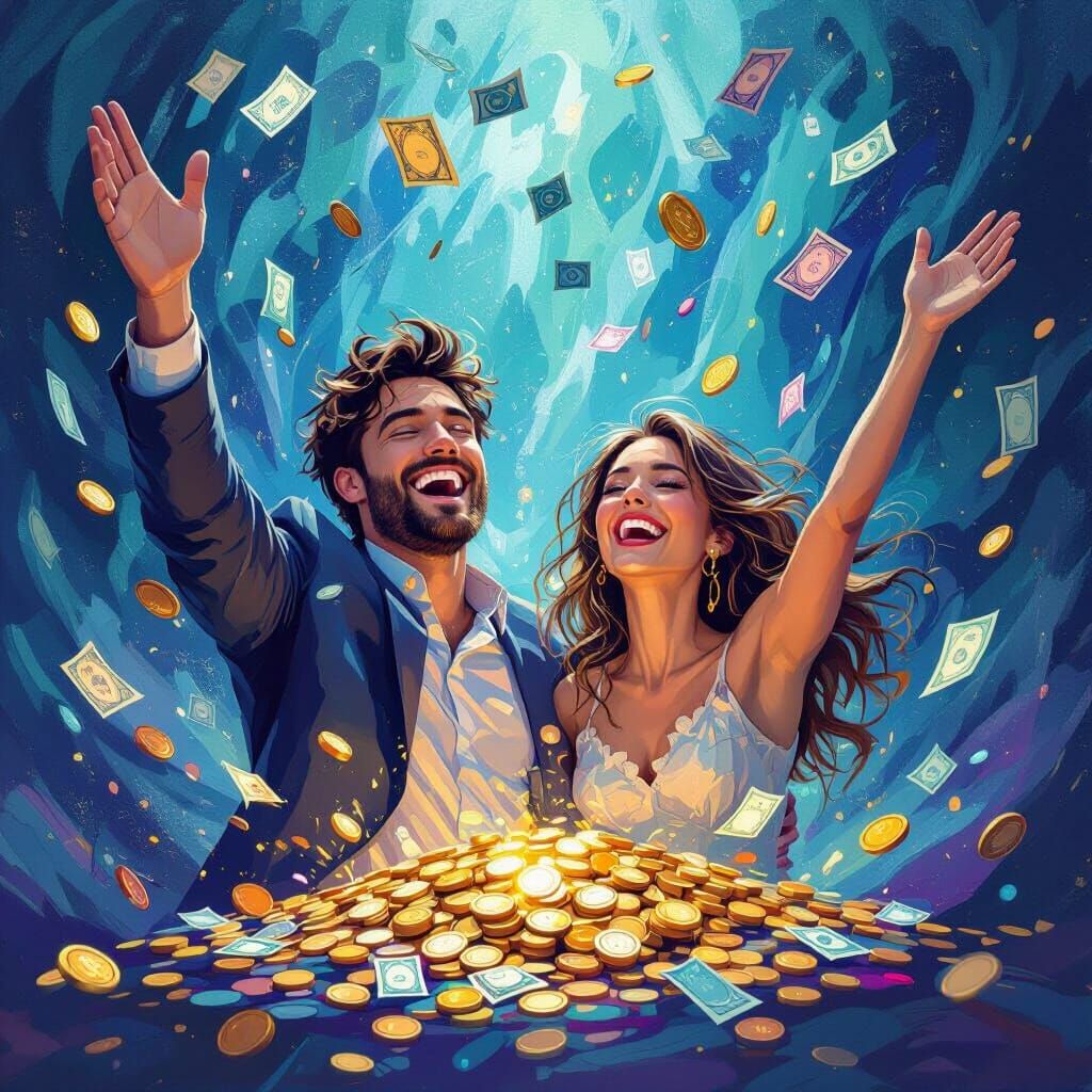 This image shows a couple celebrating winning the lottery. The scene is a fantasy painting with swirling cool colors and glowing lottery tickets, evoking a surreal and otherworldly atmosphere.
