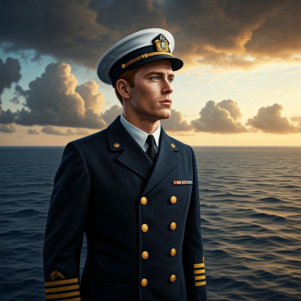 This image shows a 19-year-old merchant marine with auburn hair in a 1969 uniform. He stands on a ship's deck, looking at the ocean under a cloudy sky, depicted in a detailed digital painting style.