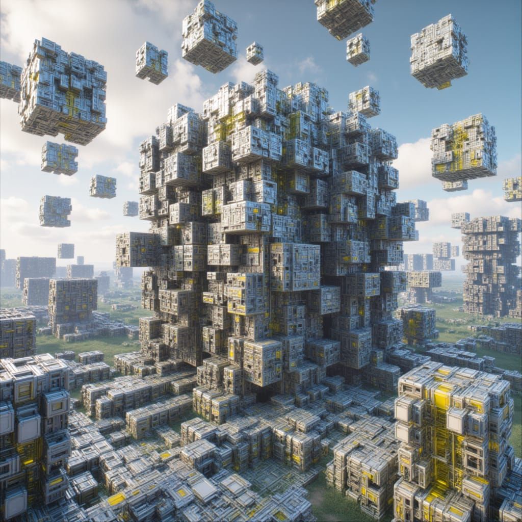 This image depicts a stunningly realistic, highly detailed house being formed from falling blocks in a futuristic nanopunk style. The scene showcases advanced construction with intricate detail.