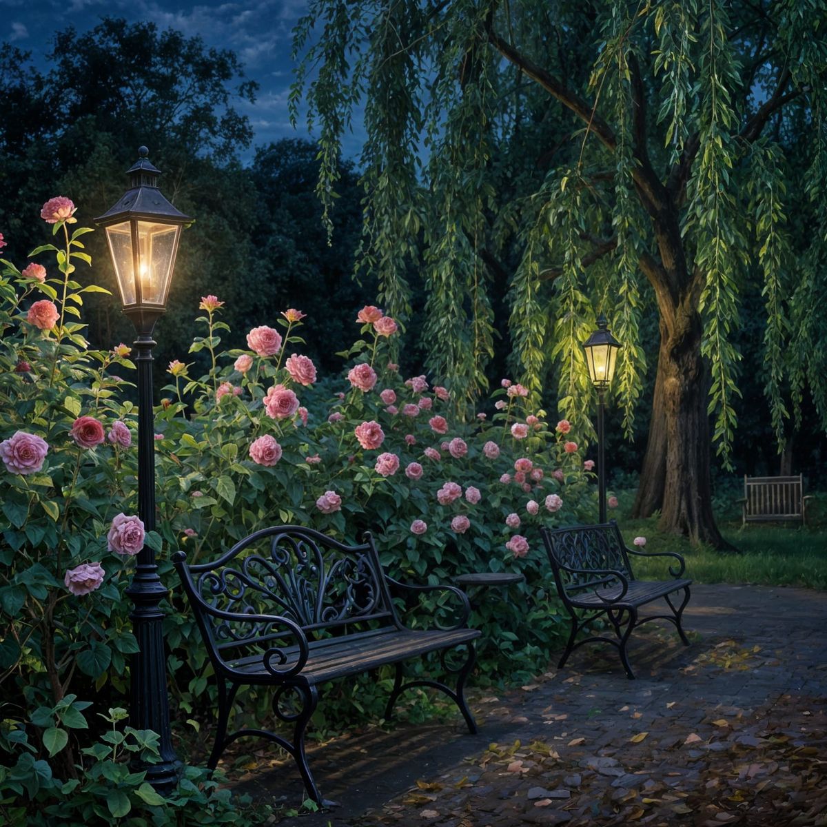 This image depicts a serene Victorian garden scene featuring elegant benches set against a mysterious dark background, evoking a tranquil, contemplative atmosphere.