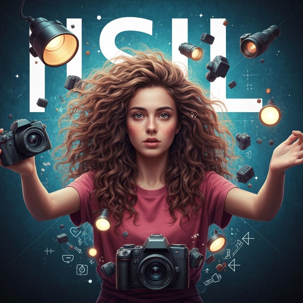 This image shows a young, creative woman with long curly hair, passionate about audiovisuals. She's surrounded by cameras and lights, conveying hope and a futuristic vision. The art style is detailed matte painting with deep, complementary colors.