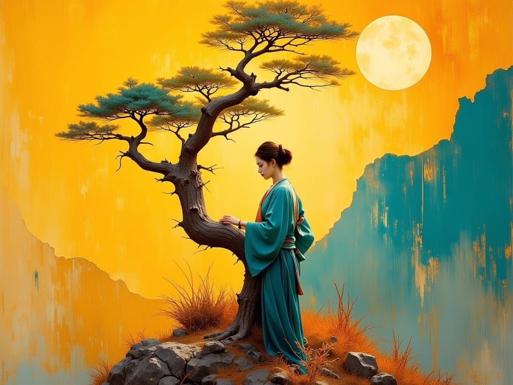 A high-definition image captures a vibrant samurai retirement ceremony. Features bright, contrasting colors, bold lines, and a detailed zen garden background, rendered in a soft oil painting style.