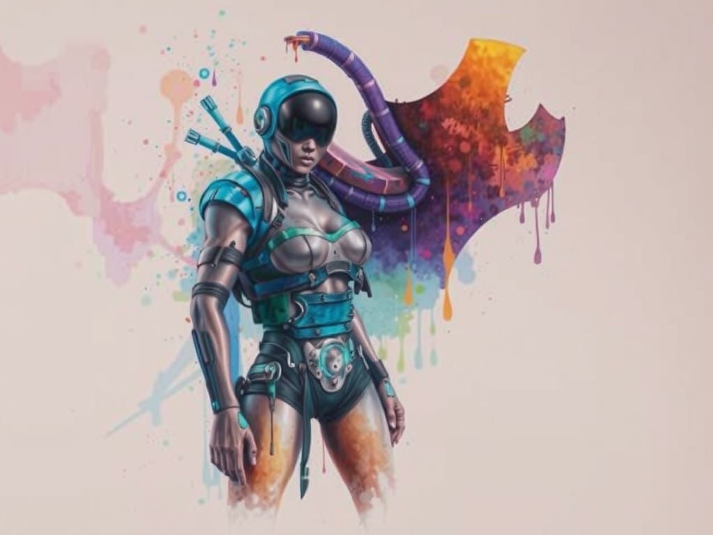 This image showcases a detailed futuristic cyborg woman against a vibrant synth wave backdrop, rendered in a dynamic watercolor splash art style with dripping paint and bold brush strokes.