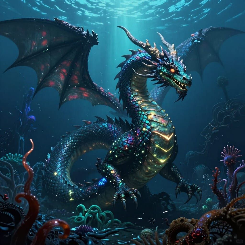 A colossal, serpentine dragon with glowing markings navigates the abyssal ocean, illuminating alien life with cinematic lighting. Ultra-detailed digital art.