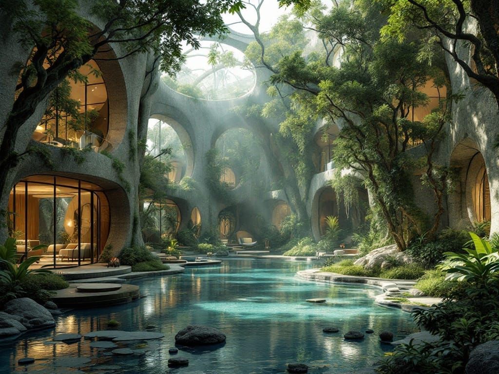 This stunning 8K image showcases an enormous eco-modern mansion interior, featuring intricate details, deep colors, and cinematic lighting, creating a fantastical atmosphere.