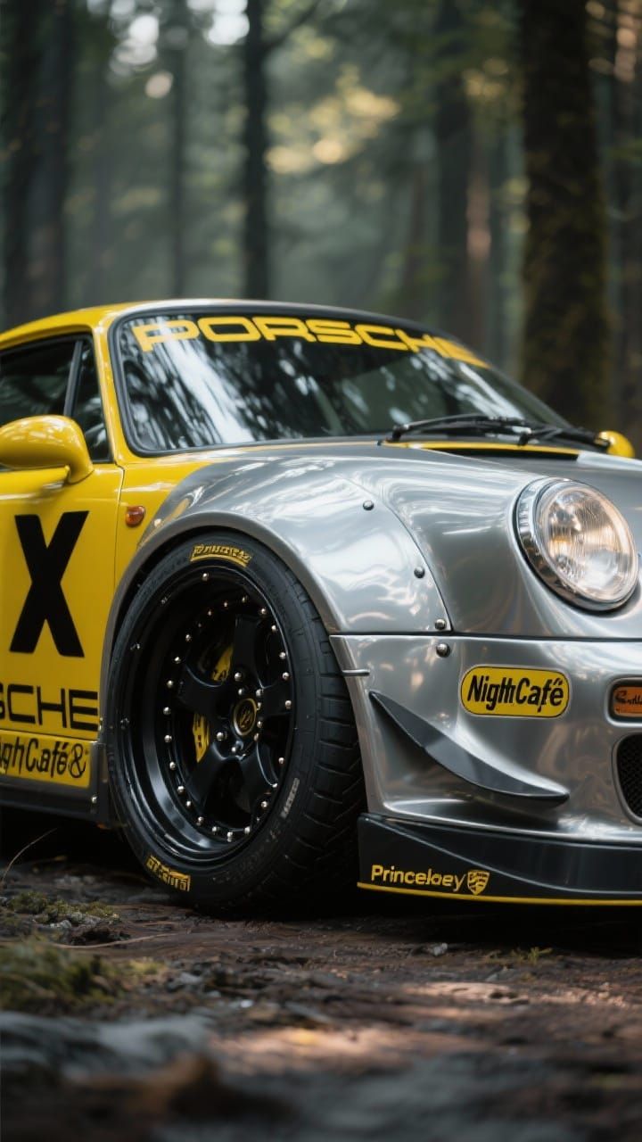 This image shows a low-angle shot of a vintage Porsche, emphasizing its curves and muscular design. The car features a silver and yellow livery with black Porsche lettering and sponsor decals, rendered with hyper-realistic details.