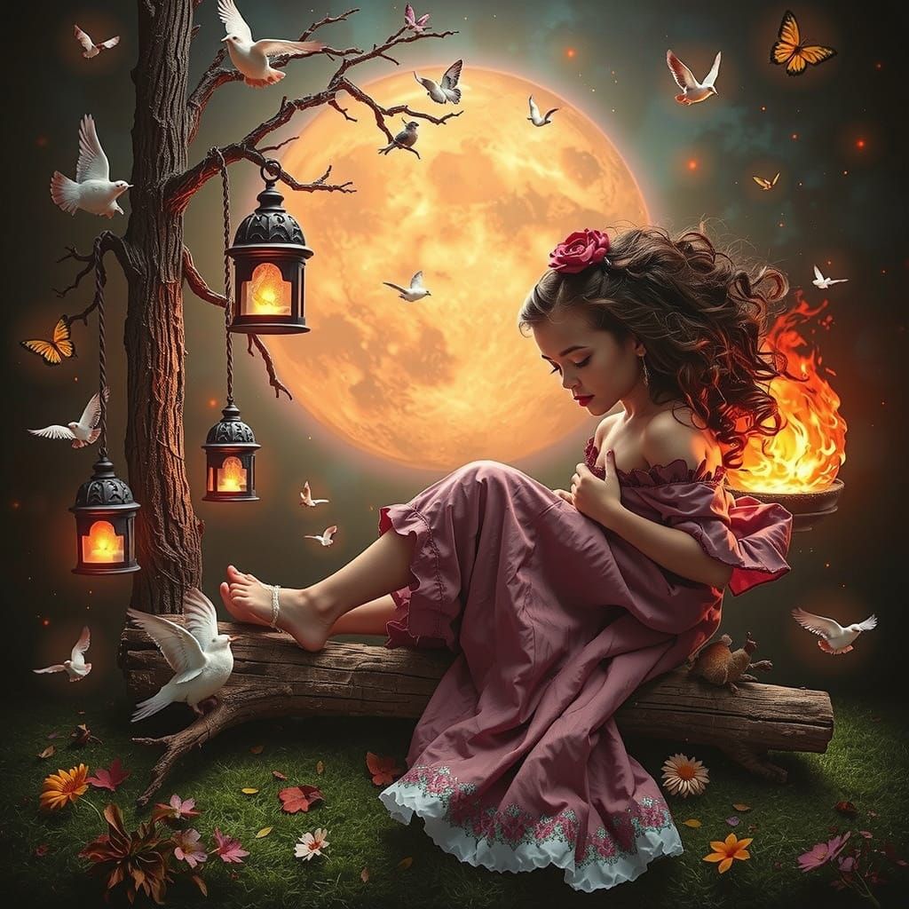 This image showcases a meticulously detailed, dramatic, and atmospheric scene, characterized by stunning triadic colors and a maximalist aesthetic.