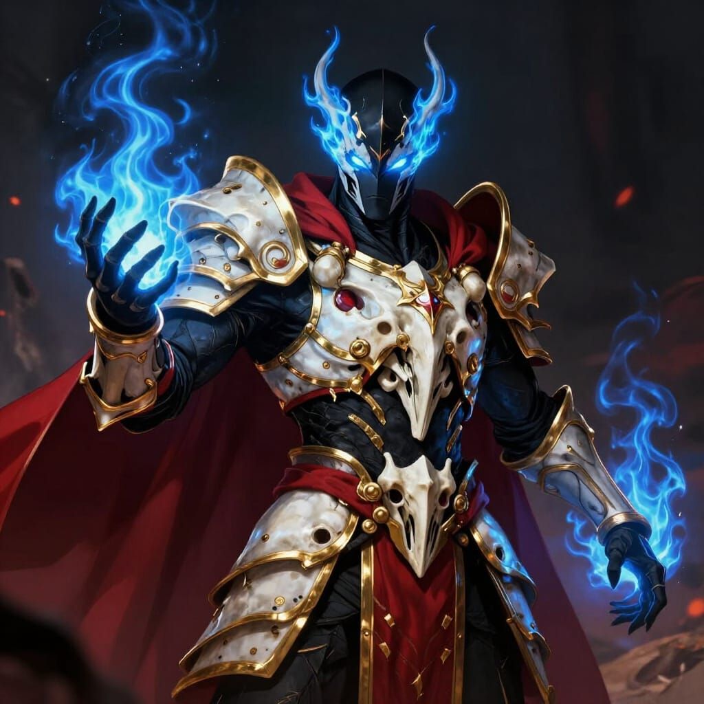 This image shows a dark fantasy warrior in black and red, wearing bone armor with gold trim and glowing blue flames. Rendered in a dramatic concept art style.