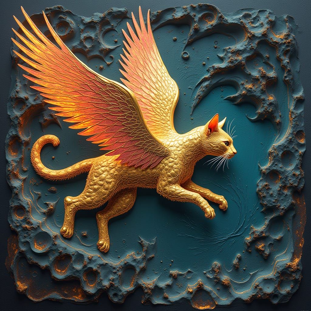 A digital painting shows a winged cat figure moving through swirling light. The image is rendered as a tribal petroglyph fresco with psychedelic colors and motion blur, in a neon noir aesthetic.