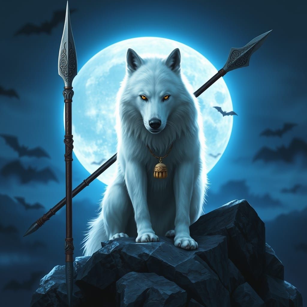This image shows a majestic white wolf with piercing yellow eyes sitting atop a rocky outcrop, illuminated by the soft glow of a full moon. Intricate designs adorn the wolf's spear, adding to its regal appearance.