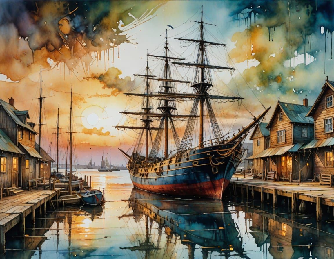 A vibrant watercolor painting of a docked ship in a coastal village. The artwork features drip techniques and a warm color palette, reminiscent of golden hour lighting.