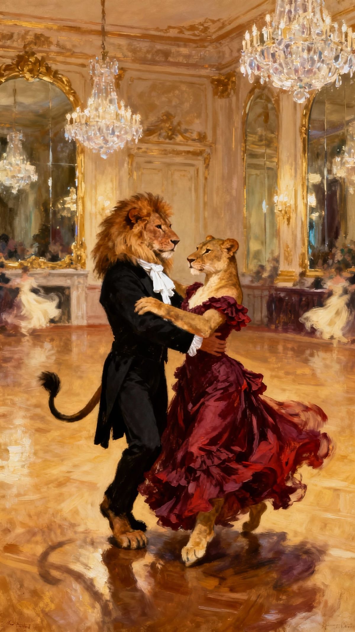 This image shows a young lion and lioness gracefully dancing in a ballroom, captured in the style of a classic oil painting with expressive brushstrokes and warm lighting.