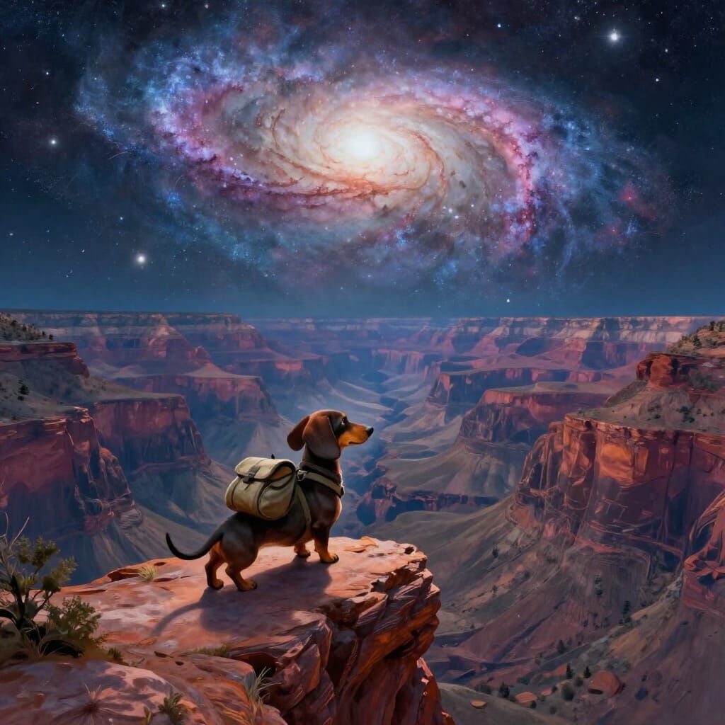 This image shows a brave dachshund explorer at a vast canyon's edge, with a luminous spiral galaxy above. Rendered as a vibrant digital painting with dramatic lighting, it evokes cosmic adventure.