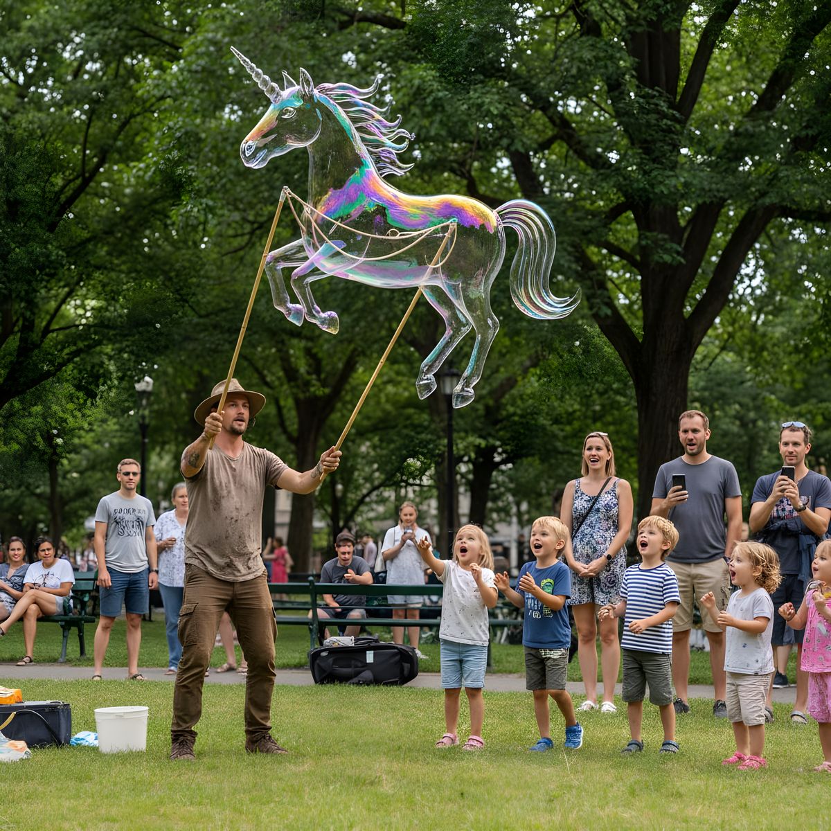 Ultra-realistic high-resolution image. A street performer in a city park creates giant soap bubbles using large professional bubble-making equipment with ropes and poles. The park is full of children and parents watching. One enormous soap bubble has just formed in the clear shape of a unicorn horse, ...