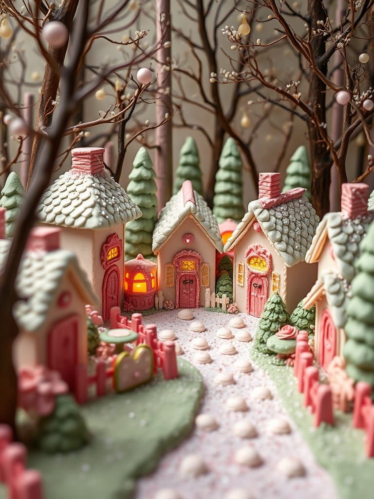 A whimsical village of edible houses nestled in a confectionery forest. The image features intricate details and warm lighting reminiscent of vintage postcards, in a Victorian-era confectionery art style.