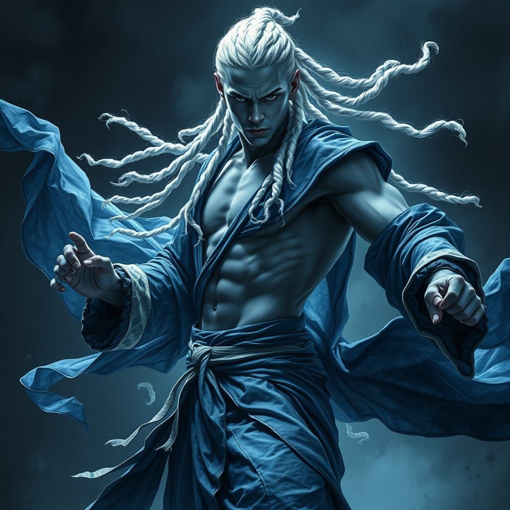 A mystical female monk with livid blue-gray skin and white braided hair stands in a dynamic pose, her revealing robes billowing around her. Inspired by dark, gothic Romanticism, this image exudes an eerie, mystical atmosphere with dramatic lighting and intense shadows accentuating her powerful physique a...