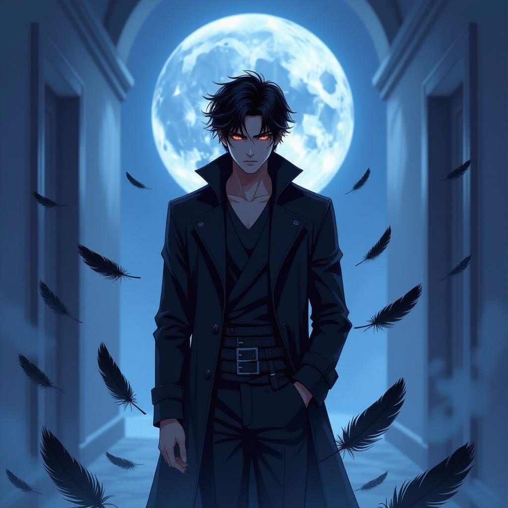 This image shows a concerned young man in dark clothing standing in a moonlit corridor. Black feathers are scattered around him as he whispers a warning in a vibrant anime style.