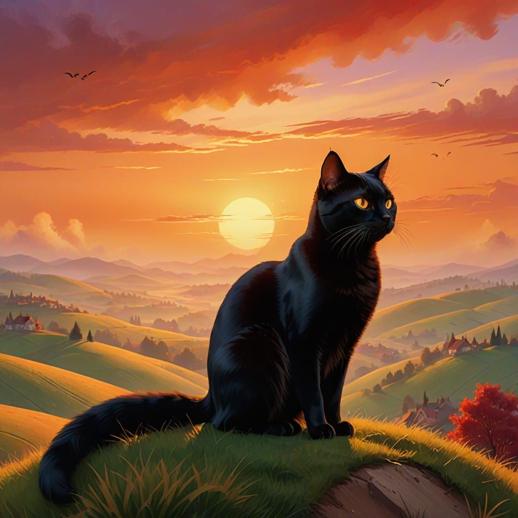 This image shows a black cat silhouetted against a vibrant sunrise. The close-up shot features warm golden light, soft orange hues, and rolling hills with mist, rendered in a fairytale-like oil painting style.