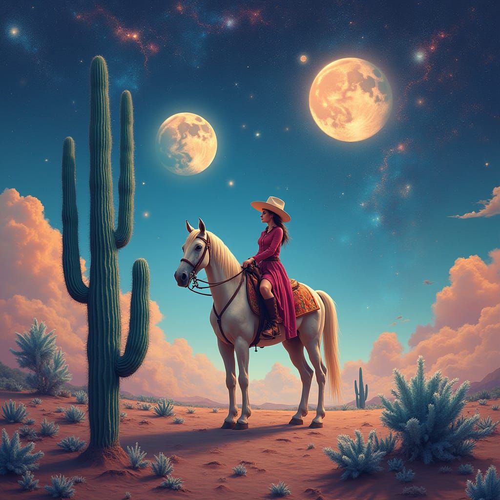 This surreal image depicts a cowgirl on a star-powered horse against a backdrop of galaxies and twin moons. Crystal cacti add to the ethereal, vast, and mysterious mood, presented in a soft, vibrant, painterly style.