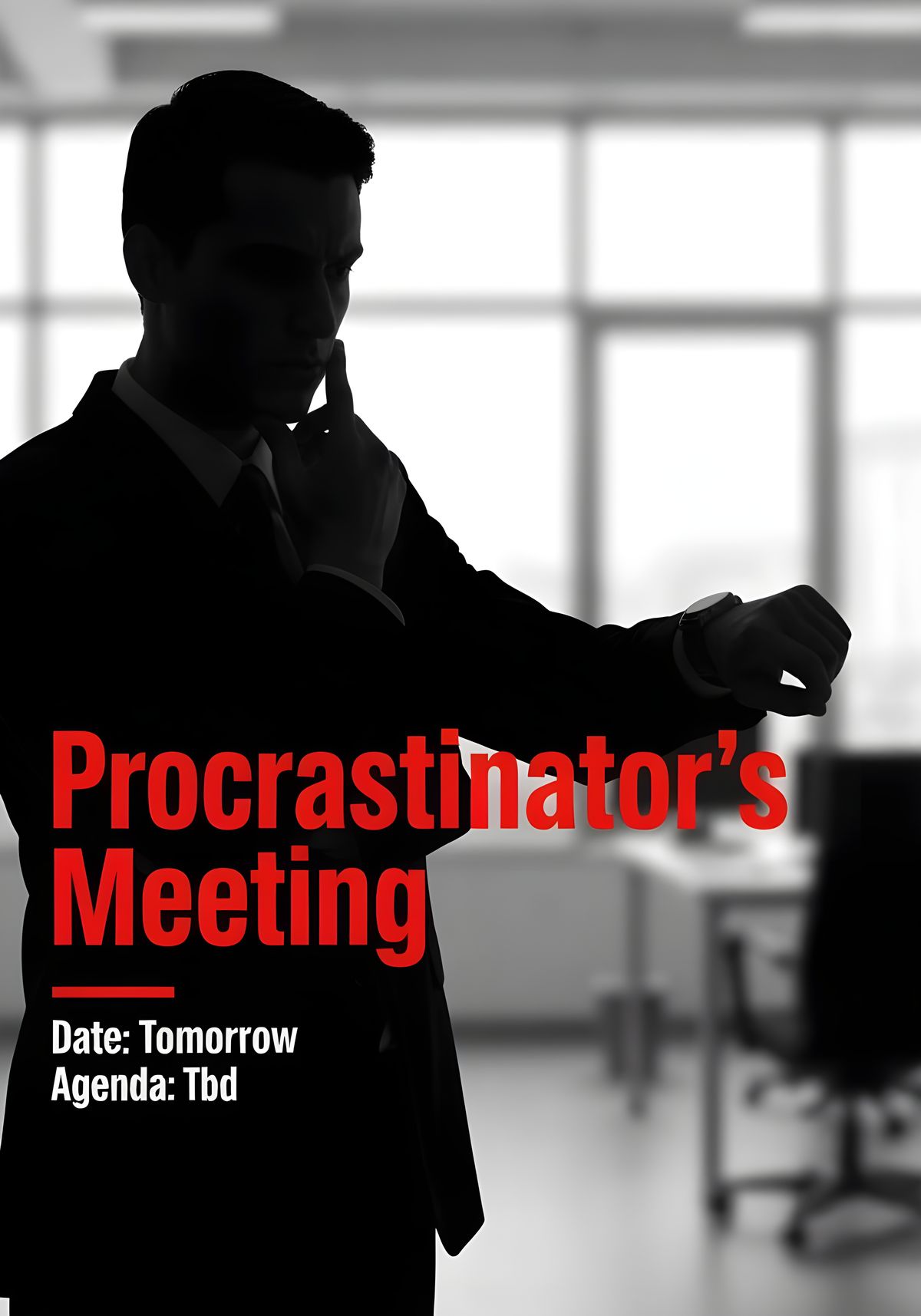 This image shows a recruitment poster featuring a silhouetted man glancing at his watch in an office. Bold red text announces a 'Procrastinator's Meeting' with intentionally vague details, in a stark black and red graphic style.
