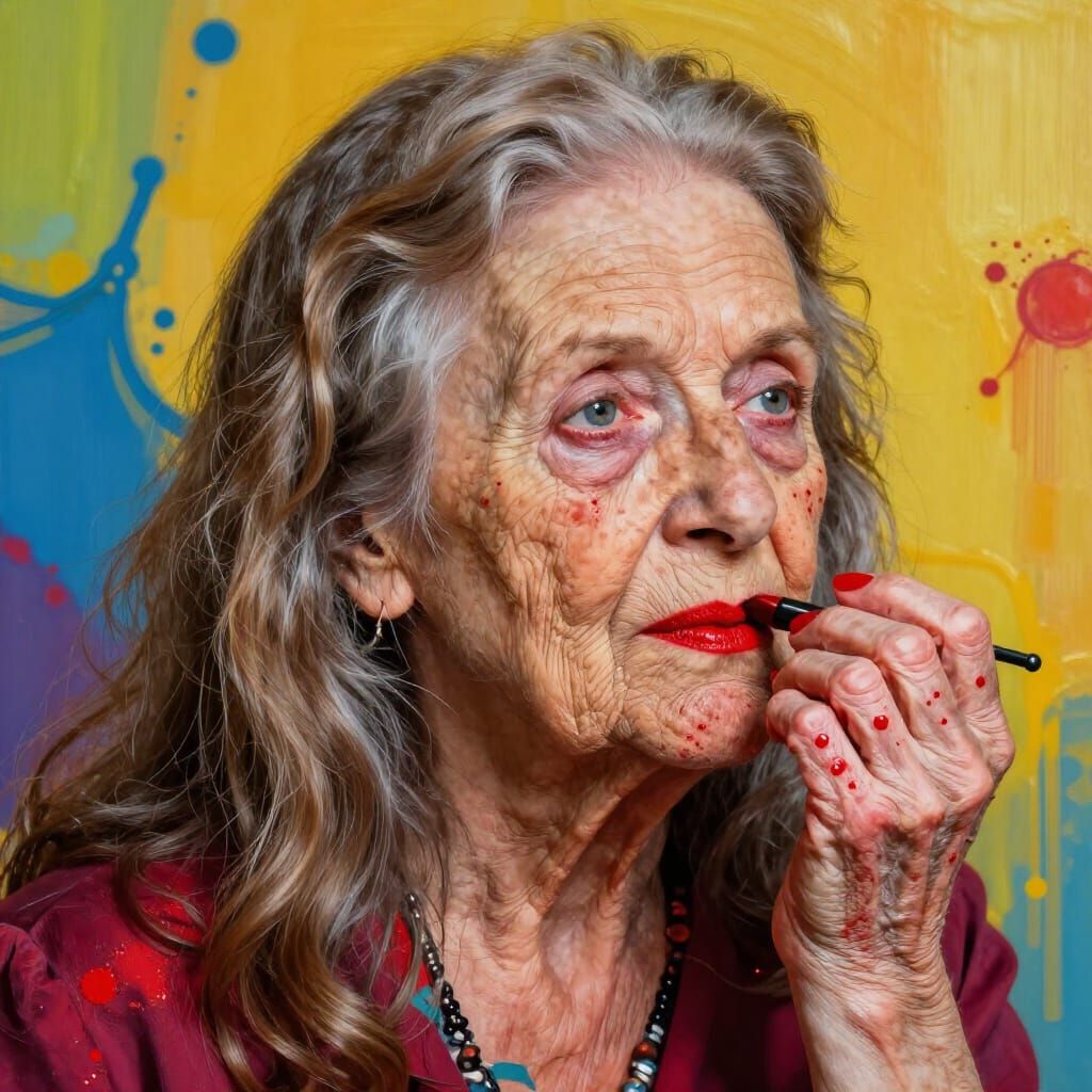 This hyperrealistic image captures an elderly woman with detailed wrinkles and long brown hair, sporting bold red lipstick and glittering nails. Her trendy outfit and deep neckline are emphasized with dramatic lighting and a vibrant background.