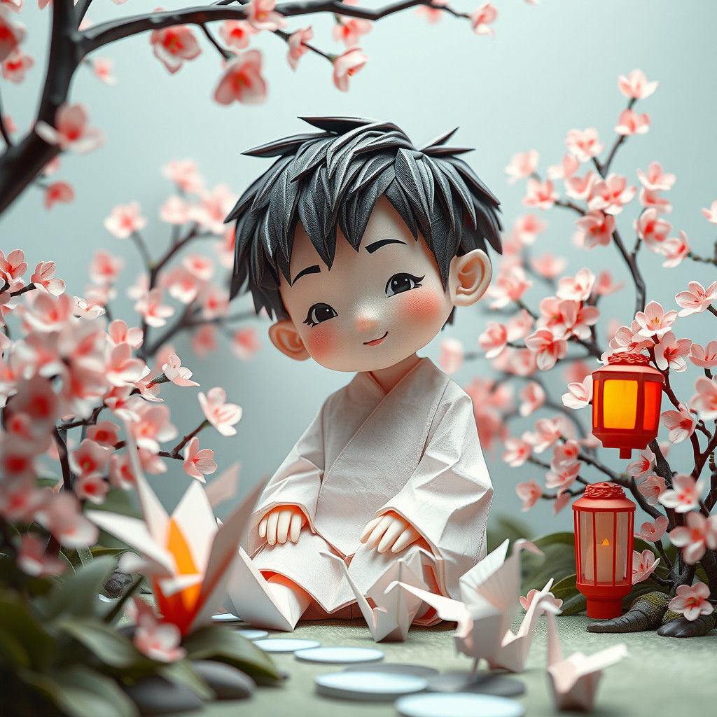 This image shows a boy made of folded origami paper in a Japanese garden. Cherry blossoms, paper cranes, and lanterns fill the scene with a dreamy, ethereal quality, as 3D rendered digital art.