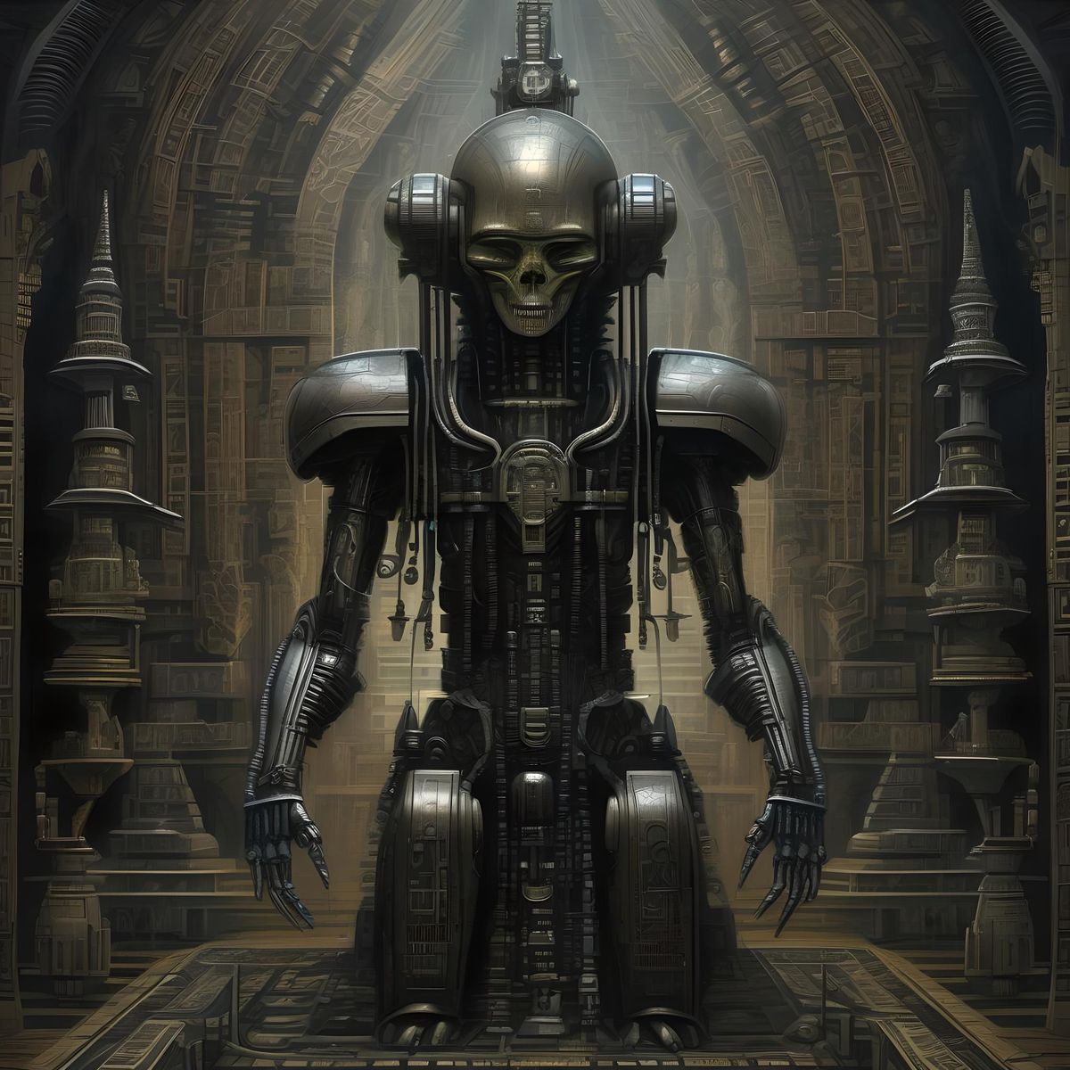 detailed painting of smirk sigh weave pyramid morphed segmented guard robotic full body array, vials, layered scenes dark aesthetic, +...
