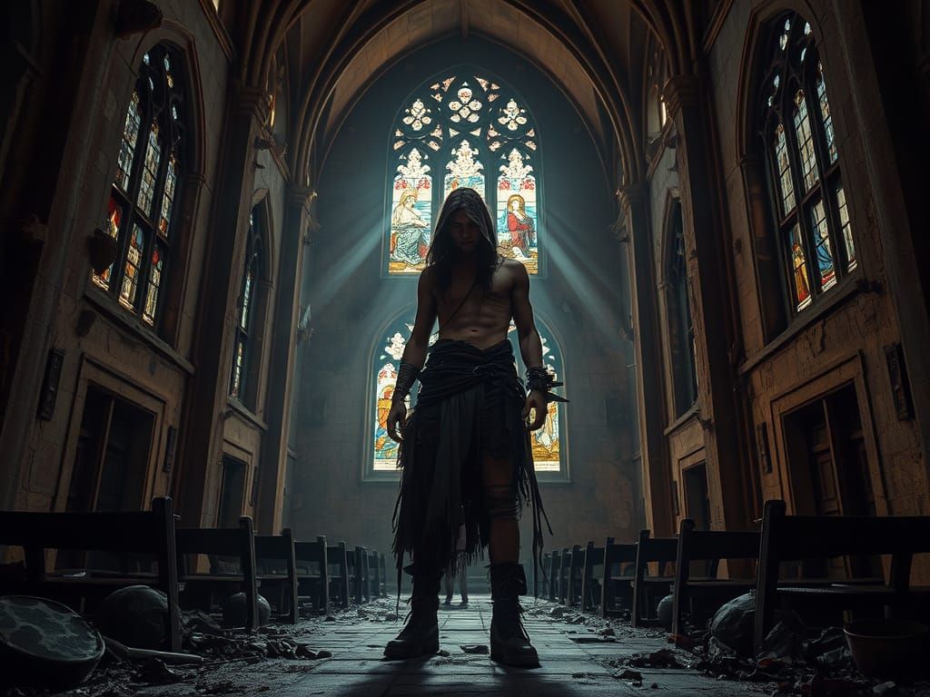 This image shows a lone figure in sacripunk clothing inside a ruined church. The scene is lit with dramatic directional lighting, and the artwork is in a dark fantasy style.