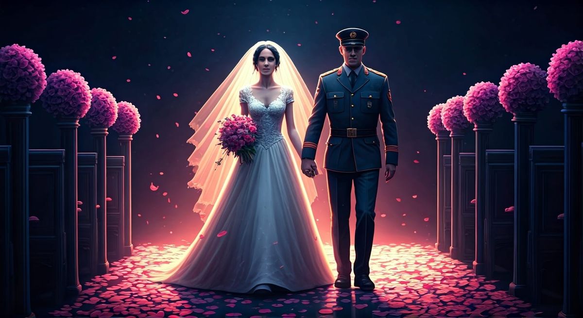 A striking picture of a bride and groom walking down the aisle. The groom is in army dress uniform. Flower petals cover the floor, with cosmic horror elements in a surreal, futuristic style.