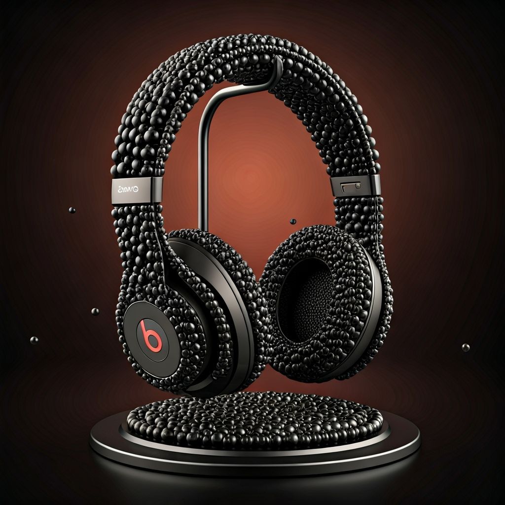 A pair of Beats Studio Pro headphones entirely sculpted from shiny black beads. Sleek, elegant, futuristic. Displayed on a metallic stand in a modern tech showroom. Hyper-realistic digital art, studio lighting, product photography style, macro detailing, high contrast rendering.