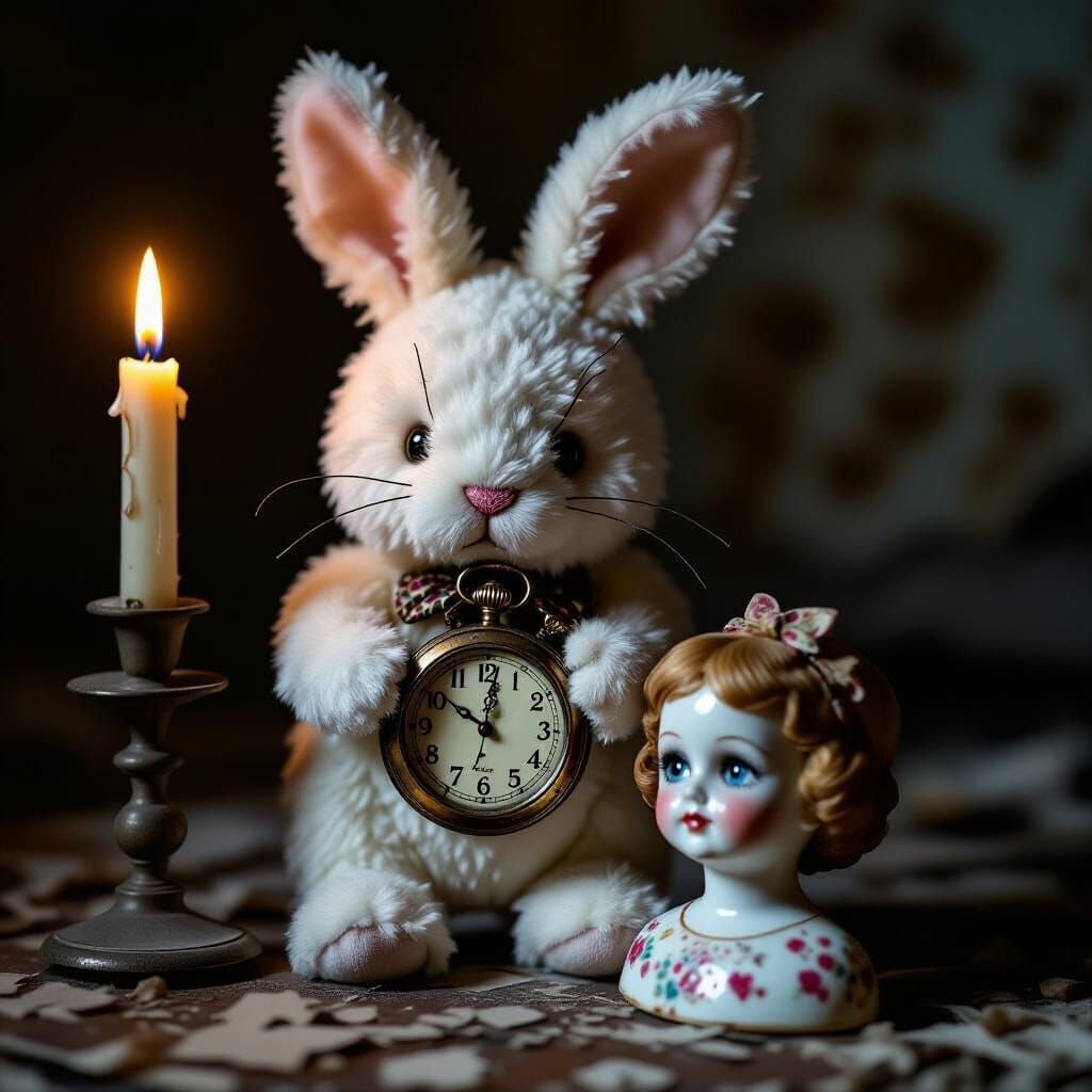 This haunting image shows a damaged bunny toy holding an antique watch, perched on a doll's head in a dark nursery, bathed in candle light.