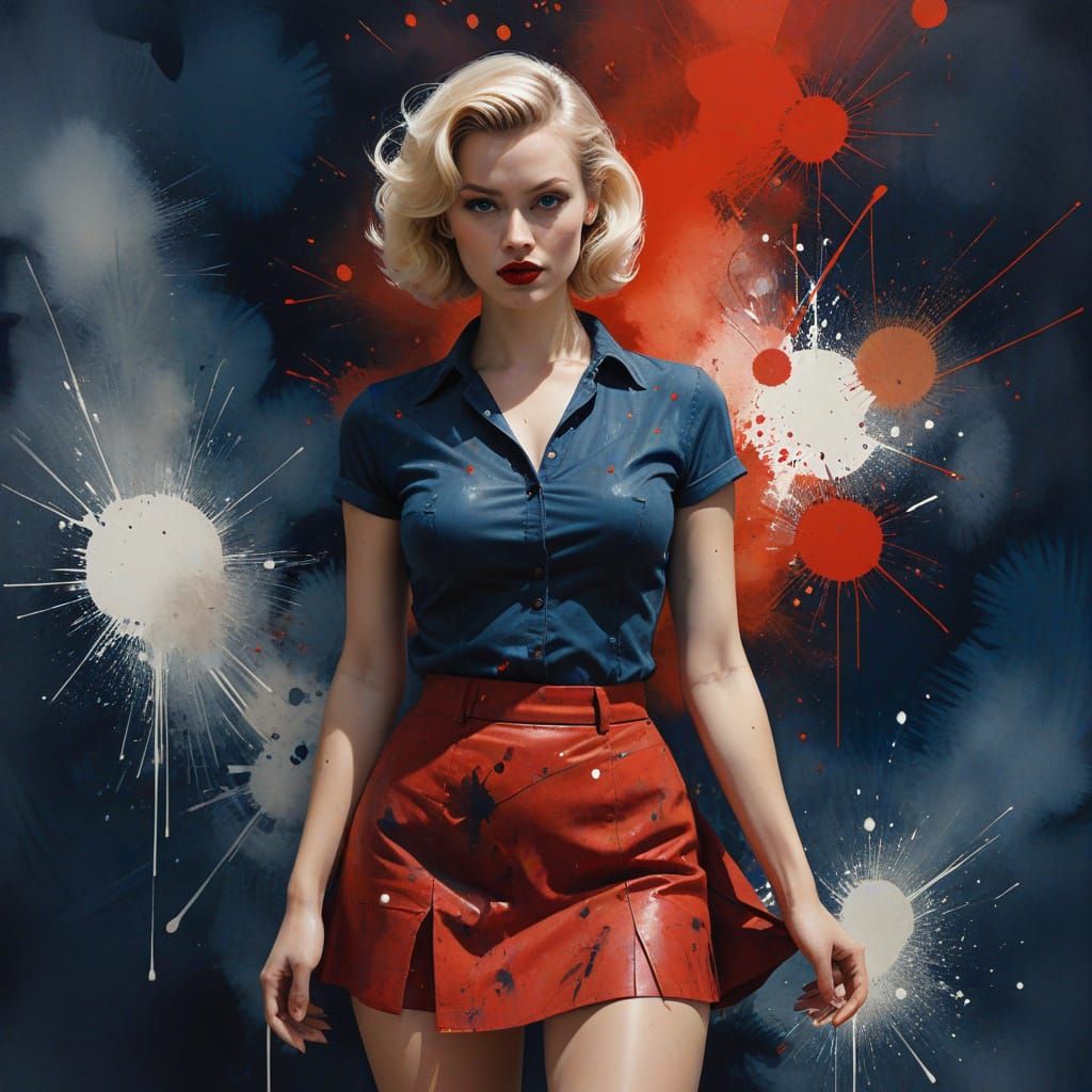 This image shows a full-body 1950s blonde pin-up woman with a bold expression, rendered in a unique watercolor and ink splatter style with smoky gradients and atmospheric effects.