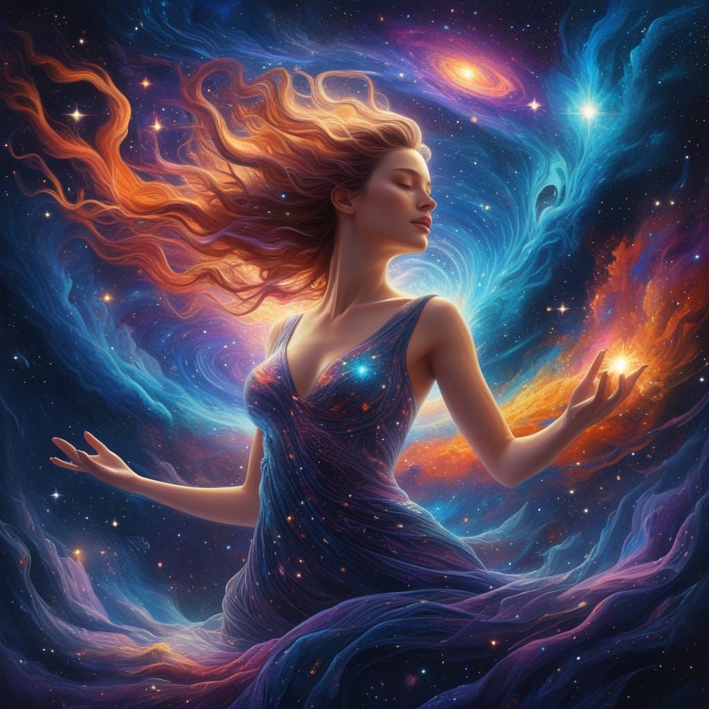 The figure is shown amidst a cosmic environment, with her "dress" and hair flowing into a fusion of a whirlpool of stars and cosmic dust.