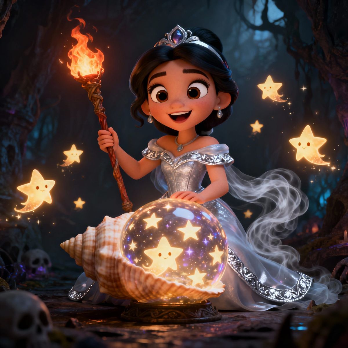 A beautiful 3D cartoon princess with large, expressive eyes leads a magical underworld ball. Souls dance like stars as she joyfully wields her staff in this Pixar-style rendering.