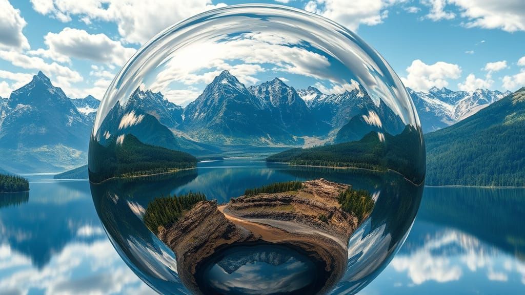 This image shows a hyperrealistic reflection of a breathtaking landscape in a polished chrome sphere, blending mountains, forests, and lakes in a visually striking way.