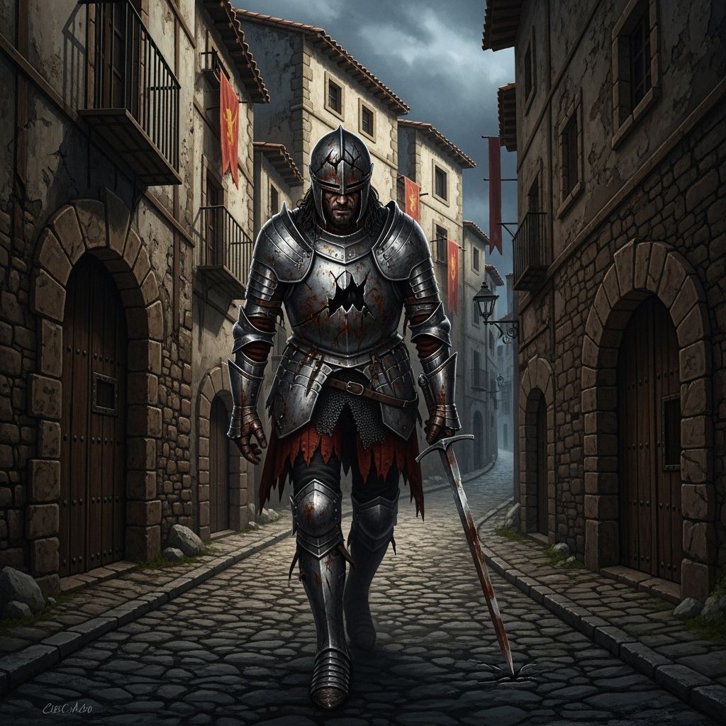 A lone knight in shattered medieval armor walks the cobblestone streets of old Spain. The image blends gothic darkness and intricate realism in a dramatic style.