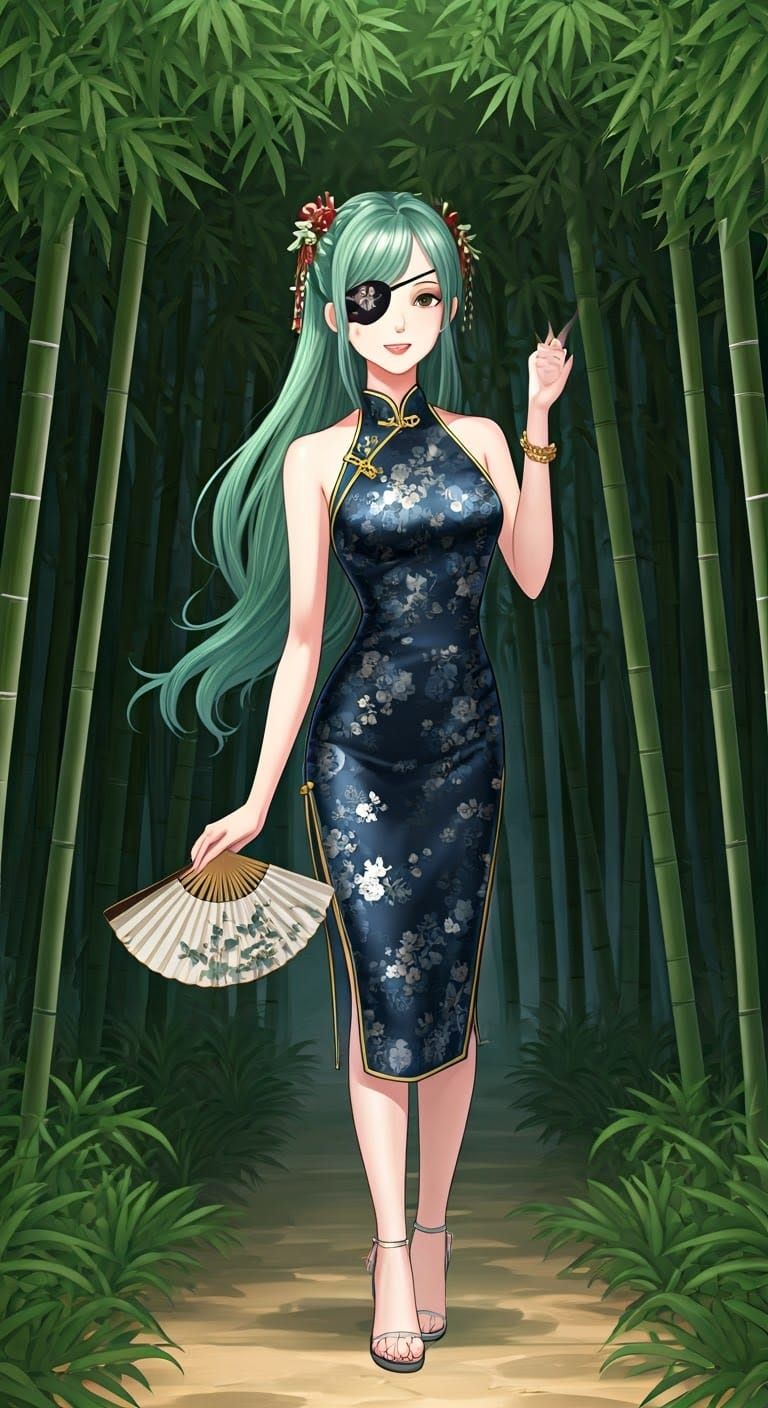This image shows a stunning Asian woman with a bright smile, jade hair, and a pirate-style eyepatch, posing elegantly amidst bamboo stalks. She wears a beautiful dark blue Chinese silk dress with floral patterns, inspired by traditional Chinese watercolor and Art Nouveau styles.