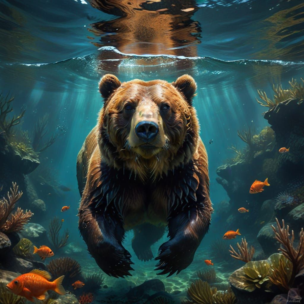 This digital painting depicts a large brown bear swimming underwater. The bear's fur is detailed with realistic textures, and it has a focused expression. The background shows a dark, aquatic environment with sunlight filtering through the water, creating a mystical ambiance. Vibrant orange fish swim ...