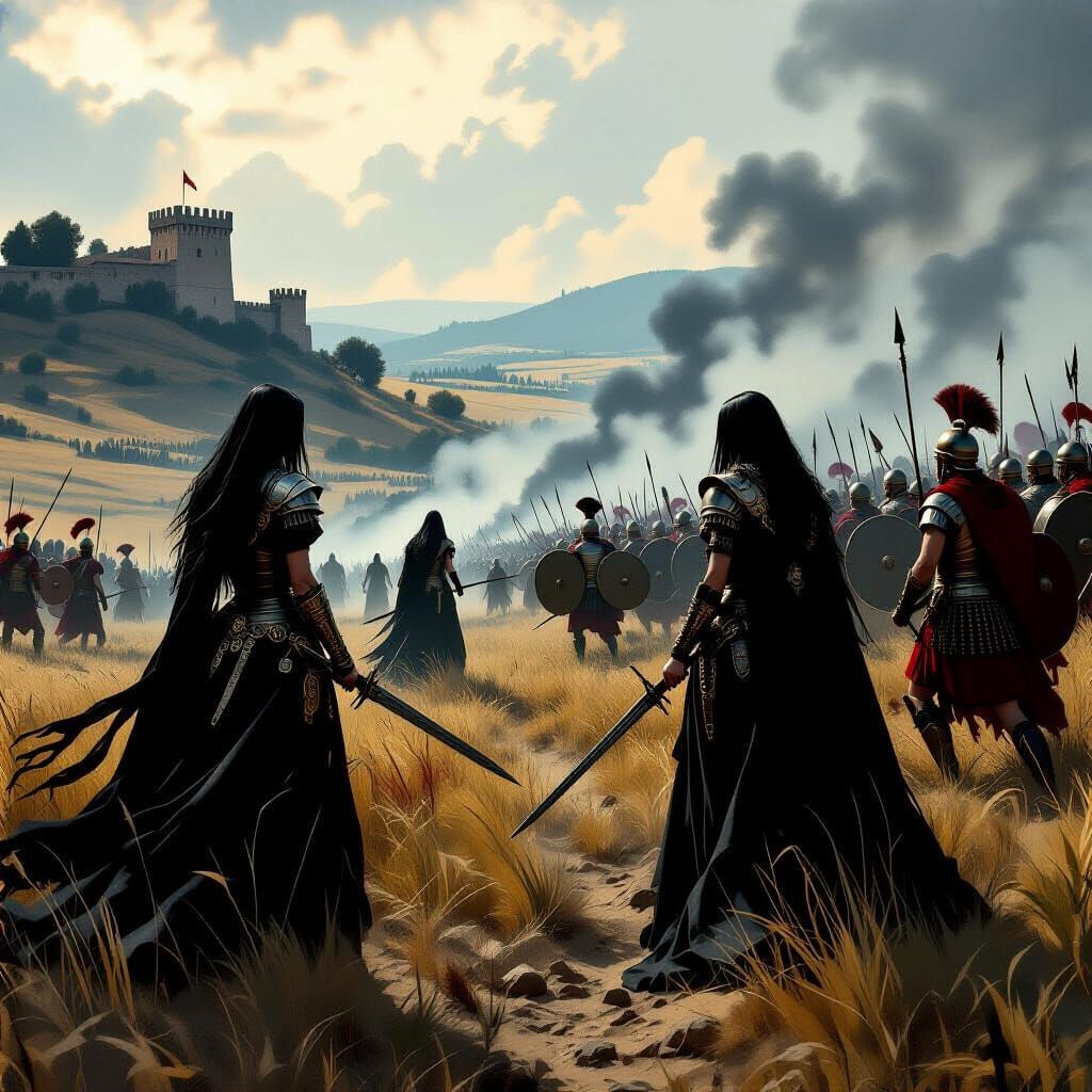 This image depicts a dramatic and intense battle scene in the style of dark fantasy concept art, featuring goth fashion models in a decisive victory.