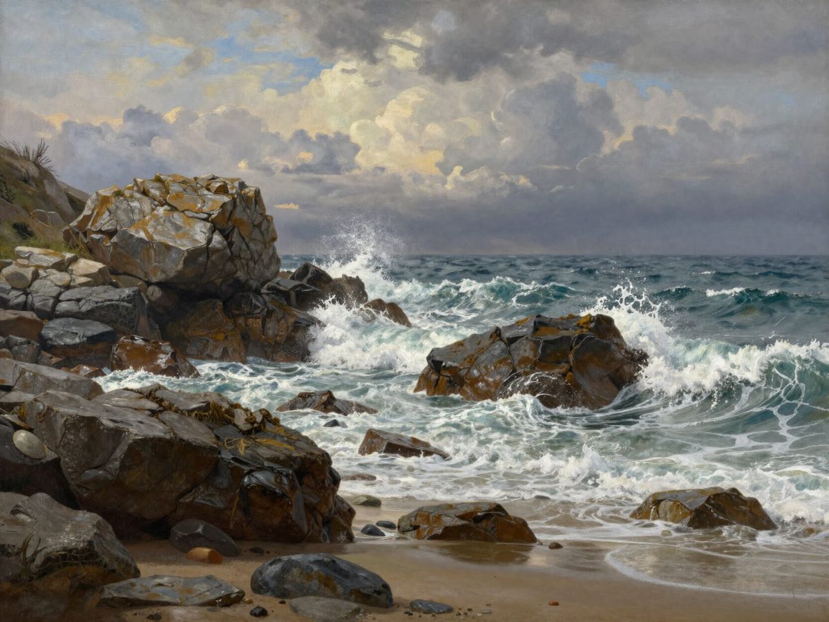 This image showcases a highly detailed and realistic painting of a rugged rocky coastline. Waves dynamically crash against the shore under a dramatic, cloudy sky, evoking romantic realism.